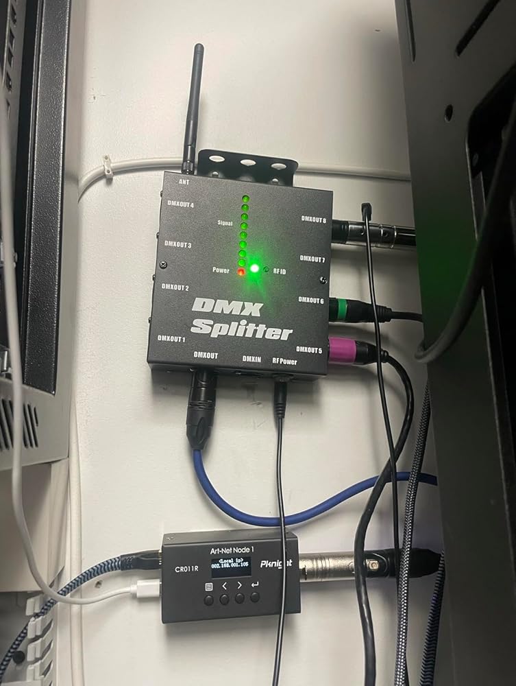 - MULTI-INTERFACE:8 DMX output(female xlr),1x DMX Input(male xlr), 1 DMX Thru (female xlr),Many interfaces meet the needs of multiple lines.