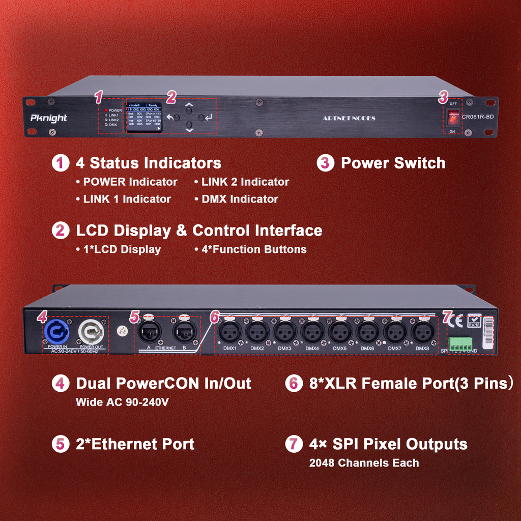 - 8 DMX/RDM Ports with Optical lsolation : Each port is configurable as IN or OUT; full isolation helps protect fixtures and keeps DMX signals clean and reliable.