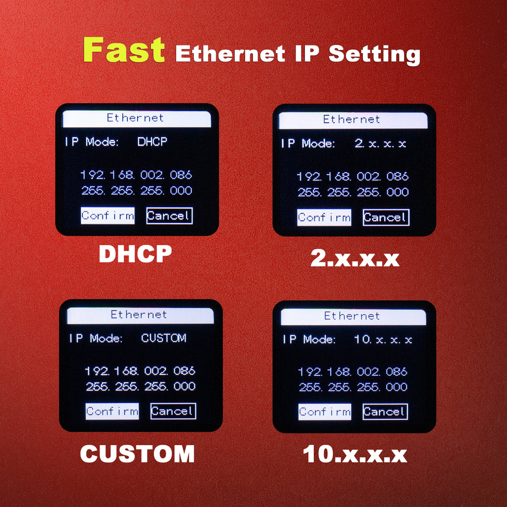 - Rich Network Presets : Supports DHCP, 10.x.x.x/8 and 2.x.x.x/8 ranges, plus custom iP and subnet mask for faster, more flexible networking.